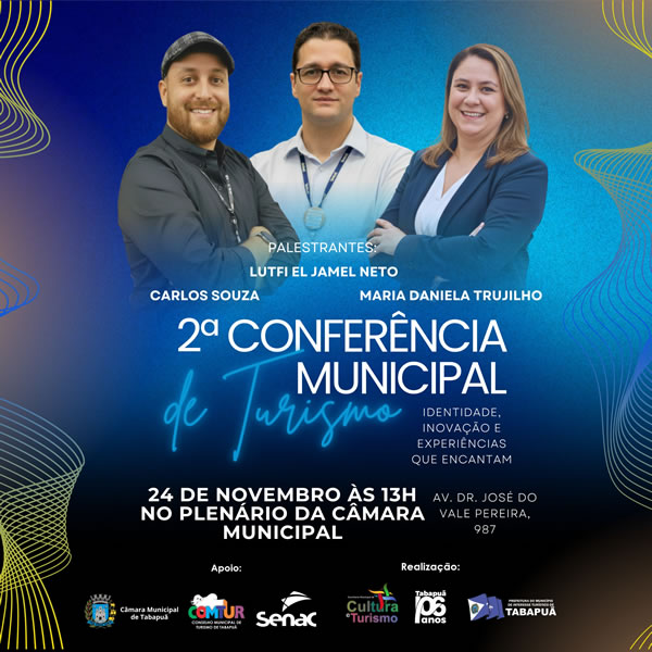 A Prefeitura de Tabapuã, por meio da Secretaria Municipal de Cultura e Turismo, com o apoio da Câmara Municipal, do SENAC e do COMTUR – Conselho Municipal de Turismo, convida toda a população, empresários, comércios, artesãos, empresas, entidades e o poder público a participarem da 2ª Conferência Municipal de Turismo, que neste ano tem como tema: “Identidade, Inovação e Experiências que Encantam”.