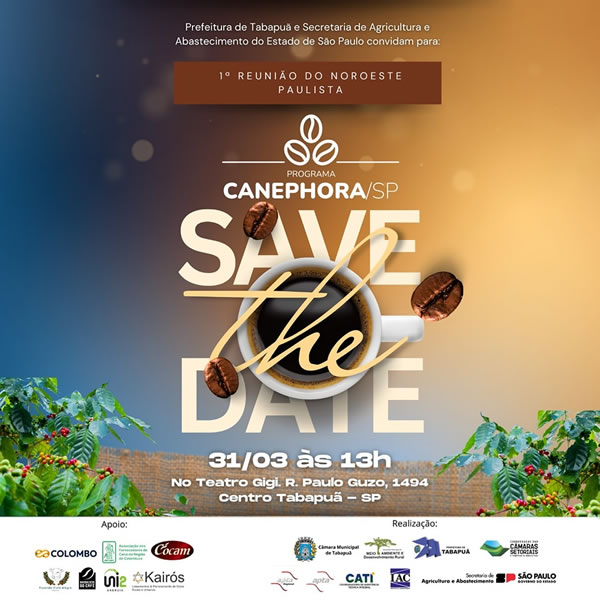 A Prefeitura de Tabapuã e a Secretaria de Agricultura e Abastecimento do Estado de São Paulo convidam todos para este grande encontro sobre o cultivo de café Canephora (Conilon e Robusta) na região!