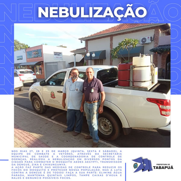 Nos dias 27, 28 e 29 de março (quinta, sexta e sábado), a Equipe de Combate a Vetores, em parceria com a Secretaria Municipal de Saúde e a Coordenadoria de Controle de Doenças, realizou a nebulização em diversos pontos da cidade para combater o mosquito Aedes aegypti, transmissor da dengue, zika e chikungunya.