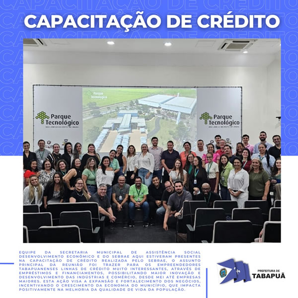 Equipe da Secretaria Municipal de Assistência Social Desenvolvimento Econômico e do SEBRAE AQUI estiveram presentes na Capacitação de Crédito realizada pelo SEBRAE, o assunto principal da reunião foi trazer para os empreendedores tabapuanenses linhas de crédito muito interessantes, através de empréstimos e financiamentos, possibilitando maior inovação e desenvolvimento das indústrias e comércio, desde MEI até empresas maiores. Esta ação visa a expansão e fortalecimento dos negócios, incentivando o crescimento da economia do município, que impacta positivamente na melhoria da qualidade de vida da população.