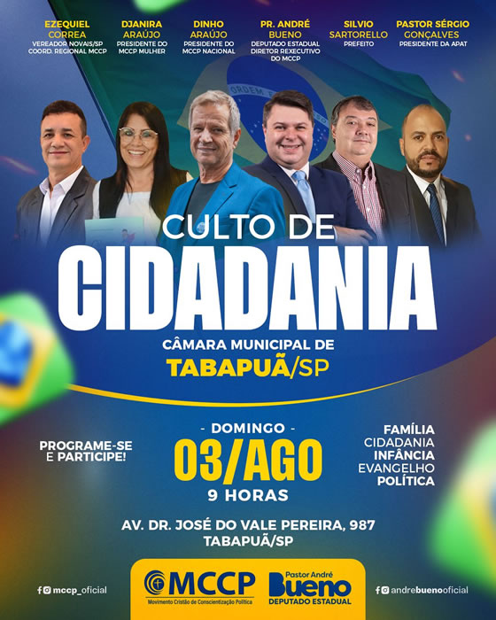No próximo domingo, 03 de agosto, a partir das 9h, será realizado o Culto de Cidadania na Câmara Municipal de Tabapuã/SP (Av. Dr. José do Vale Pereira, 987). O evento é aberto ao público e tem como foco a valorização da cidadania, da família, da infância e do engajamento social.