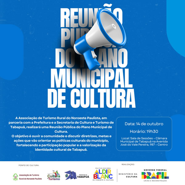 A Prefeitura de Tabapuã, por meio da Secretaria Municipal de Cultura e Turismo, convida a comunidade para participar da Reunião Pública do Plano Municipal de Cultura, que será realizada pela Associação de Turismo Rural do Noroeste Paulista (ATRNP).