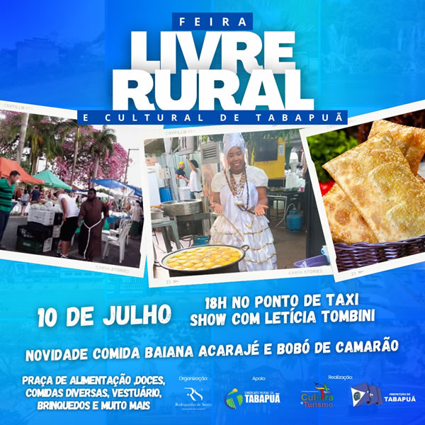 A Feira Livre, Rural e Cultural de Tabapuã chega com muitas delícias, novidades e música boa! E neste mês, a grande novidade é a comida baiana da Cris Baiana, com direito a acarajé quentinho e bobó de camarão irresistível!