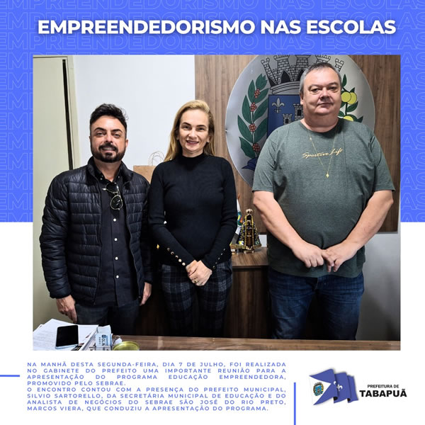 Na manhã desta segunda-feira, dia 7 de julho, foi realizada no gabinete do prefeito uma importante reunião para a apresentação do programa Educação Empreendedora, promovido pelo SEBRAE.