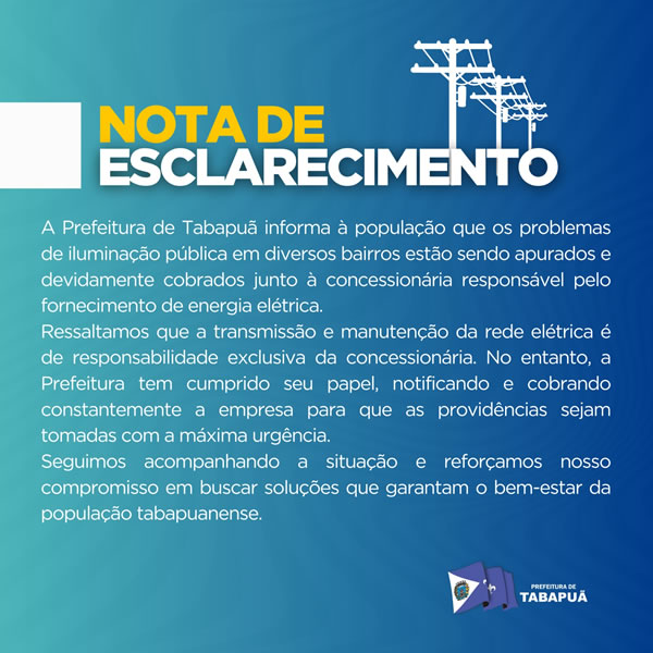 A Prefeitura de Tabapuã informa à população que os problemas de iluminação pública em diversos bairros estão sendo apurados e devidamente cobrados junto à concessionária responsável pelo fornecimento de energia elétrica.