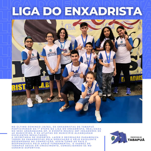 No último domingo (16/02), os enxadristas de Tabapuã participaram da 1ª Etapa da Liga do Enxadrista, realizada no SESC Araraquara-SP. O evento reuniu 287 jogadores de 40 municípios, e os atletas do município alcançaram excelentes resultados.
