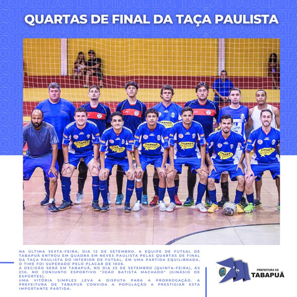 Na última sexta-feira, dia 12 de setembro, a equipe de futsal de Tabapuã entrou em quadra em Neves Paulista pelas quartas de final da Taça Paulista do Interior de Futsal. Em uma partida equilibrada, o time foi superado pelo placar de 10x6.