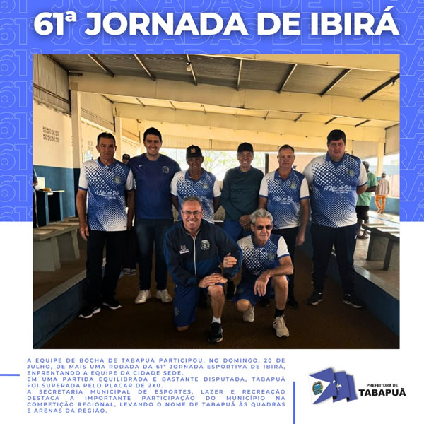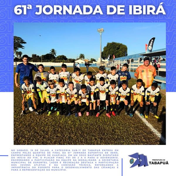 No sábado, 19 de julho, a categoria Sub-11 de Tabapuã entrou em campo pelas quartas de final da 61ª Jornada Esportiva de Ibirá, enfrentando a equipe de Guapiaçu. Em um jogo bastante disputado do início ao fim, o placar final foi de 2 a 0 para o adversário, encerrando a participação da equipe na modalidade.