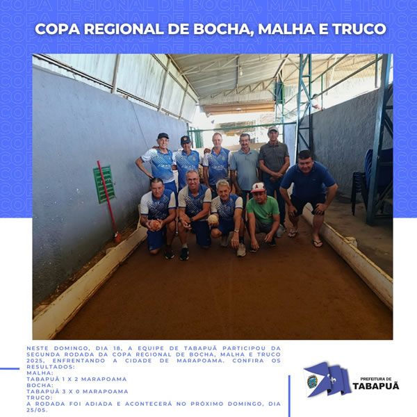 Neste domingo, dia 18, a equipe de Tabapuã participou da segunda rodada da Copa Regional de Bocha, Malha e Truco 2025, enfrentando a cidade de Marapoama. Confira os resultados: