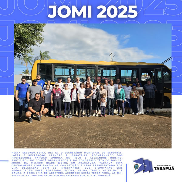 Na manhã de hoje, a delegação de Tabapuã embarcou rumo à cidade de Araçatuba para participar do 27º Jogos da Melhor Idade (JOMI), levando na bagagem muita preparação, entusiasmo e o orgulho de representar o nosso município.