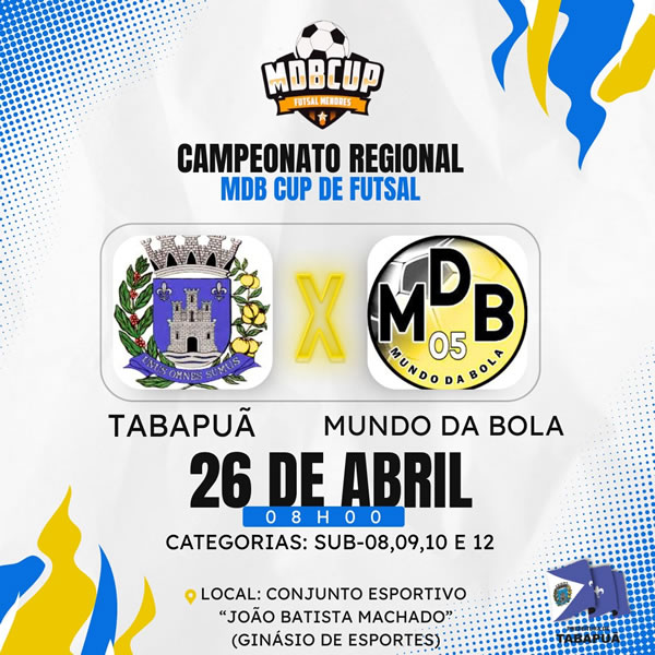 Neste sábado, 26 de abril, Tabapuã entra em quadra pelo Campeonato MDB CUP de Futsal 2025. A cidade enfrentará a equipe Mundo da Bola, de Catanduva, nas categorias Sub-08, Sub-09, Sub-10 e Sub-12.