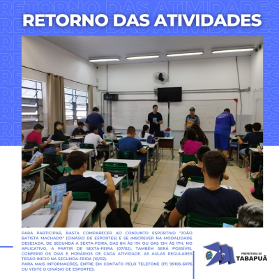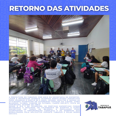 Desde o dia 3 de fevereiro, as práticas esportivas foram retomadas e seguirão um calendário de eventos e ações esportivas em todos os bairros. A população pode acompanhar a programação completa e os horários das modalidades pelo aplicativo Esporte Tabapuã e pelas redes sociais.