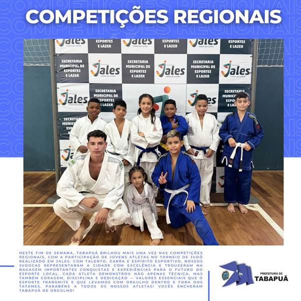 Neste fim de semana, Tabapuã brilhou mais uma vez nas competições regionais, com a participação de jovens atletas no torneio de Judô realizado em Jales. Com talento, garra e espírito esportivo, nossos judocas representaram a cidade com excelência e trouxeram na bagagem importantes conquistas e experiências para o futuro do esporte local.