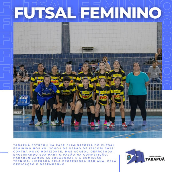 Tabapuã estreou na fase eliminatória do Futsal Feminino nos XVI Jogos de Verão de Itajobi 2025 contra Novo Horizonte, mas acabou derrotada, encerrando sua participação na competição.