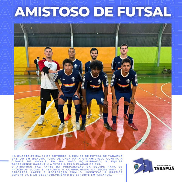 Na quarta-feira, 15 de outubro, a equipe de futsal de Tabapuã entrou em quadra fora de casa para um amistoso contra a cidade de Novais. Em um jogo equilibrado, a equipe tabapuense garantiu a vitória pelo placar de 5x3.