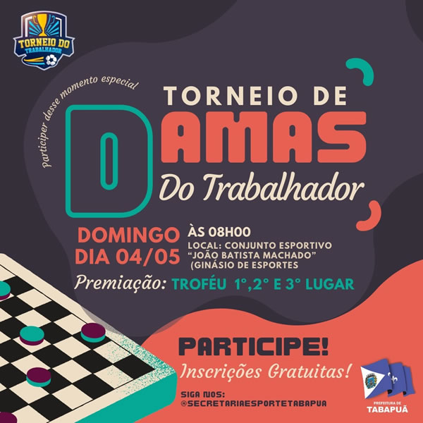 A Secretaria de Esportes, Lazer e Recreação convida todos os trabalhadores e toda a população para participarem do Torneio de Damas do Trabalhador, o evento será realizado no dia 04 de maio a partir das 08h no Conjunto Esportivo "João Batista Machado" (Ginásio de Esportes).