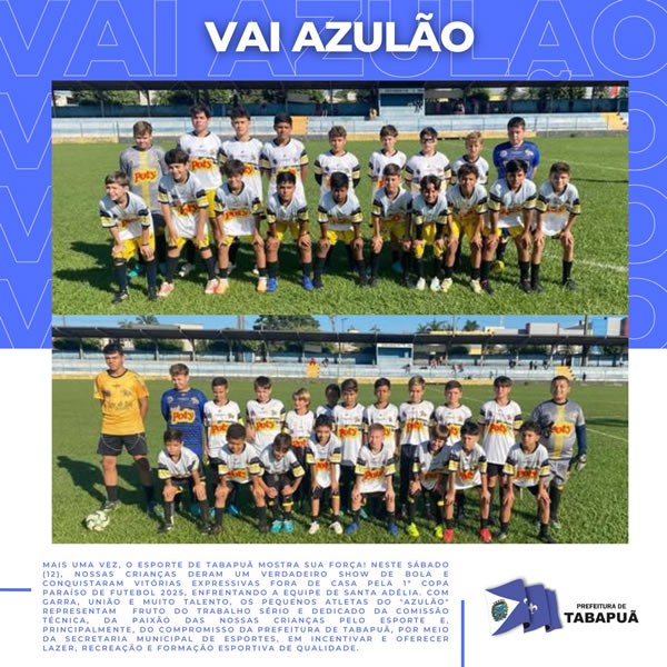 Essas conquistas são fruto do trabalho sério e dedicado da comissão técnica, da paixão das nossas crianças pelo esporte e, principalmente, do compromisso da Prefeitura de Tabapuã, por meio da Secretaria Municipal de Esportes, em incentivar e oferecer lazer, recreação e formação esportiva de qualidade.