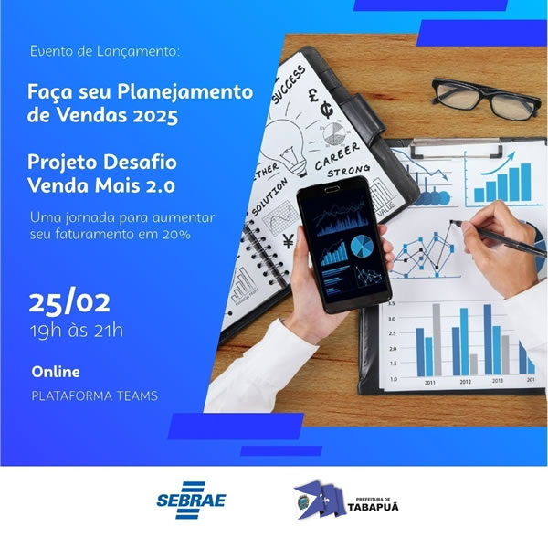 A Prefeitura de Tabapuã, em parceria com o SEBRAE convida você para o lançamento do PROJETO DESAFIO VENDA MAIS 2.0! Uma jornada prática e inovadora, com encontros coletivos e consultorias individuais, criada para ajudar sua empresa a superar desafios, alavancar vendas e crescer 20% no faturamento!
