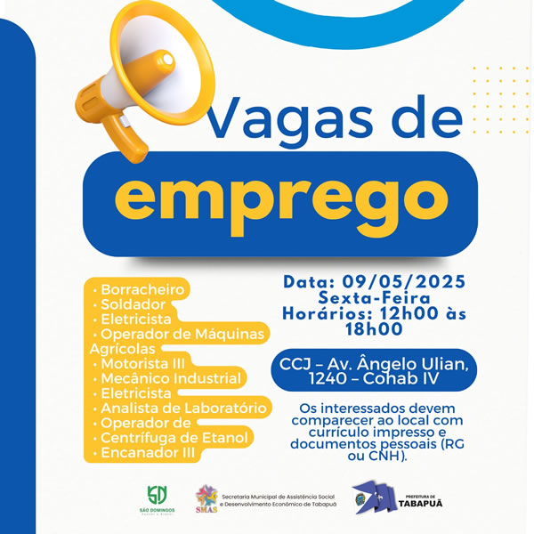 Atenção, moradores de Tabapuã e região! No dia 09 de maio de 2025, das 12h às 18h, será realizado um grande Feirão de Empregos no CCJ - Av. Ângelo Ulian, 1240 – Cohab IV.