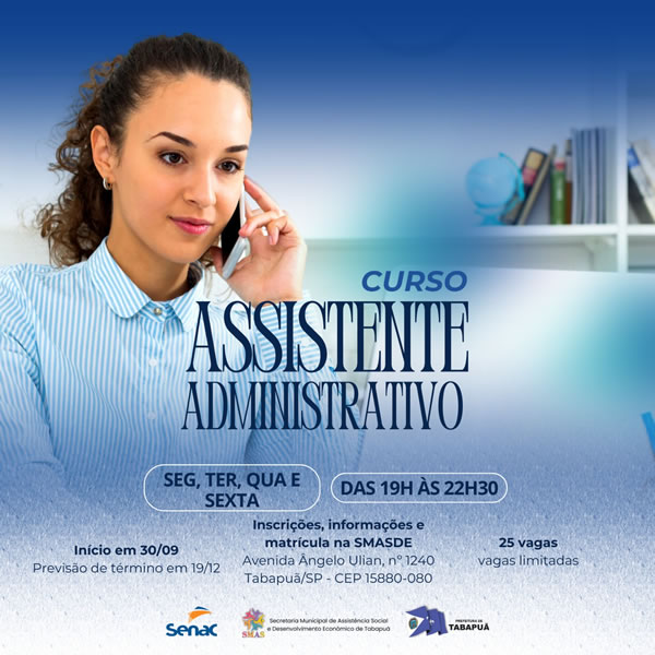 A SMASDE - Secretaria Municipal de Assistência Social e Desenvolvimento Econômico, em parceria com a Prefeitura de Tabapuã e o SENAC, oferece gratuitamente o Curso de Assistente Administrativo.
