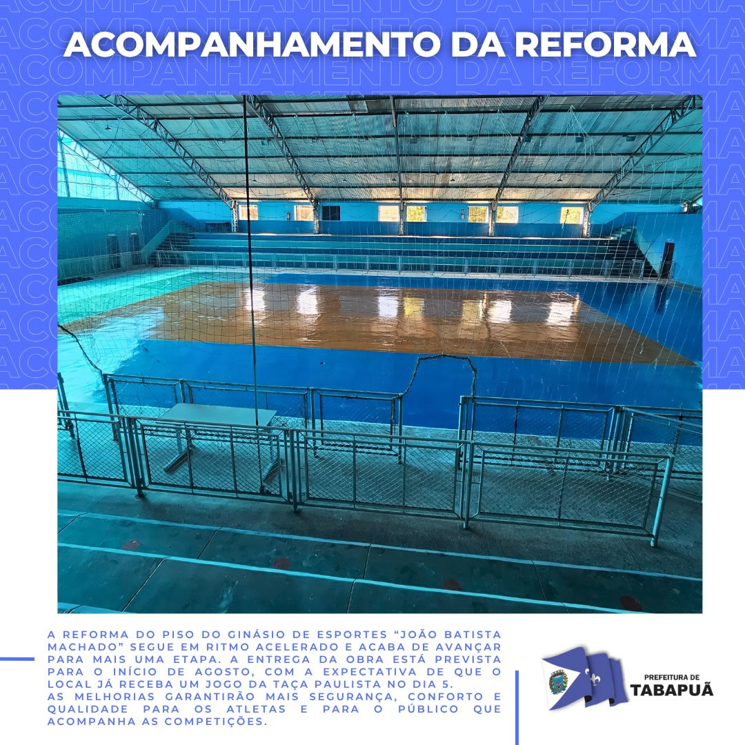 A reforma do piso do Ginásio de Esportes “João Batista Machado” segue em ritmo acelerado e acaba de avançar para mais uma etapa. A entrega da obra está prevista para o início de agosto, com a expectativa de que o local já receba um jogo da Taça Paulista no dia 5.