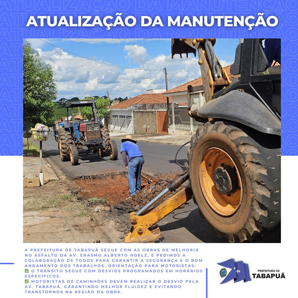 A Prefeitura de Tabapuã segue com as obras de melhoria no asfalto da Av. Erasmo Alberto Hoelz, e pedimos a colaboração de todos para garantir a segurança e o bom andamento dos trabalhos.