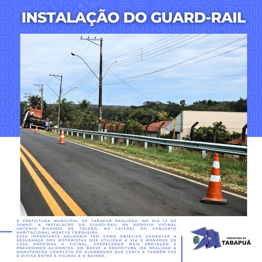 A Prefeitura Municipal de Tabapuã realizou, no dia 13 de junho, a instalação do guard-rail na Rodovia Vicinal Antonio Ricardo de Toledo, na lateral do Conjunto Habitacional Moacyr Cerqueira. Essa importante melhoria tem como objetivo aumentar a segurança dos motoristas que utilizam a via e morados de casa próximas a vicinal, oferecendo mais proteção e prevenindo acidentes. Em breve a Prefeitura irá realizar a manutenção completa do alambrado que cerca e também faz a divisa entre a vicinal e o bairro.