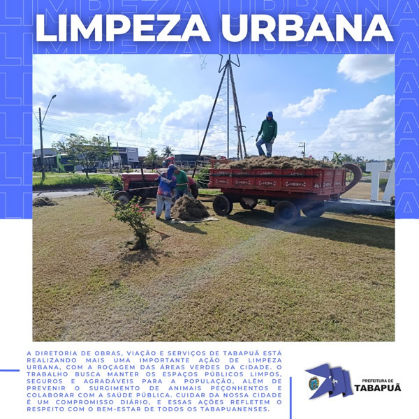 A Diretoria de Obras, Viação e Serviços de Tabapuã está realizando mais uma importante ação de limpeza urbana, com a roçagem das áreas verdes da cidade. O trabalho busca manter os espaços públicos limpos, seguros e agradáveis para a população, além de prevenir o surgimento de animais peçonhentos e colaborar com a saúde pública. Cuidar da nossa cidade é um compromisso diário, e essas ações refletem o respeito com o bem-estar de todos os tabapuanenses.