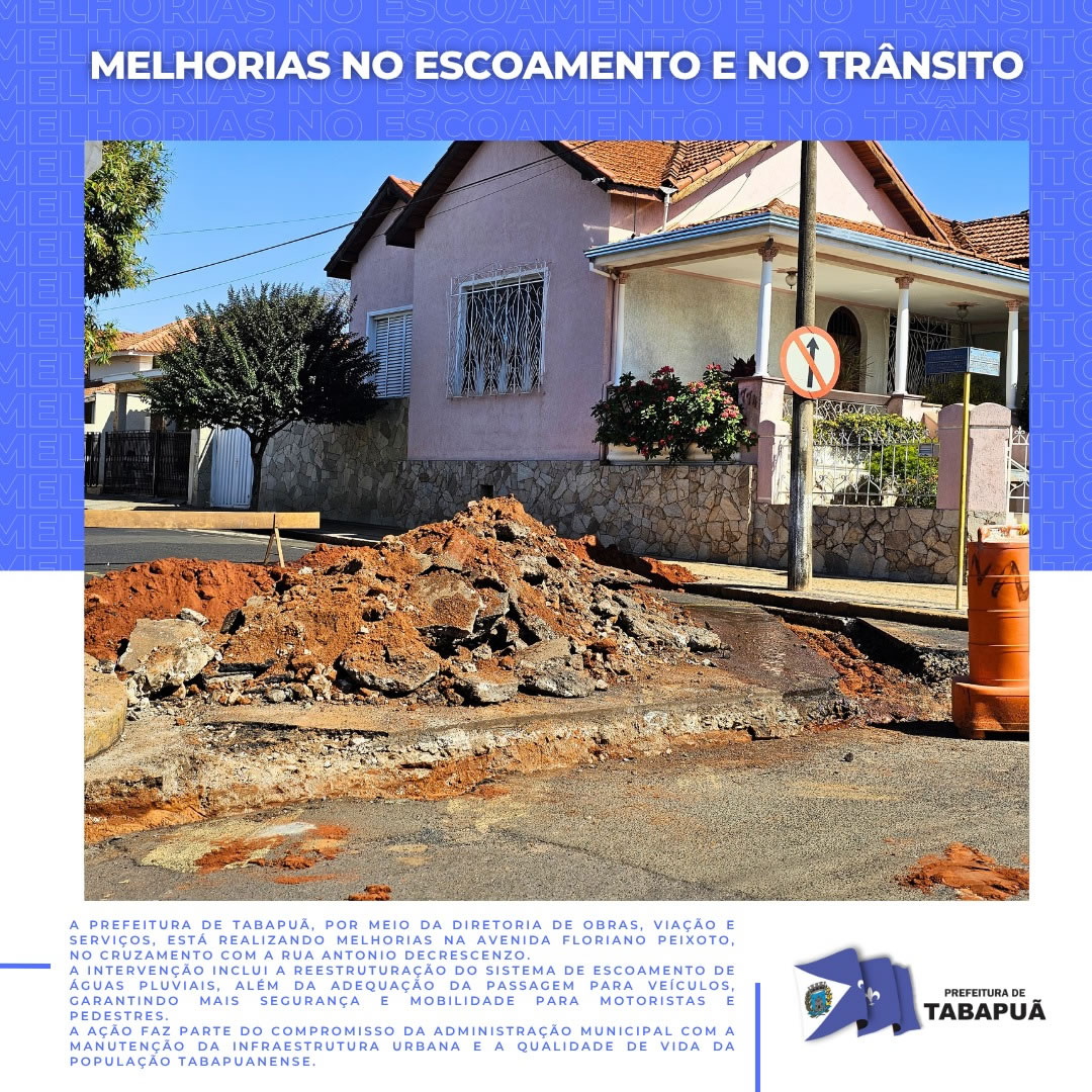 A Prefeitura de Tabapuã, por meio da Diretoria de Obras, Viação e Serviços, está realizando melhorias na Avenida Floriano Peixoto, no cruzamento com a Rua Antonio Decrescenzo.