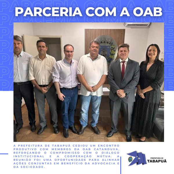 A Prefeitura de Tabapuã participou de um encontro produtivo com a OAB Catanduva, reforçando o compromisso com o diálogo institucional e a cooperação mútua. A reunião foi uma oportunidade para alinhar ações conjuntas em benefício da advocacia e da sociedade.