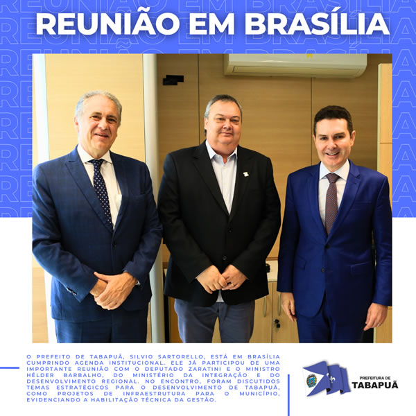 O prefeito de Tabapuã, Silvio Sartorello, está em Brasília cumprindo agenda institucional. Ele já participou de uma importante reunião com o deputado Zaratini e o ministro Hélder Barbalho, do Ministério da Integração e do Desenvolvimento Regional.