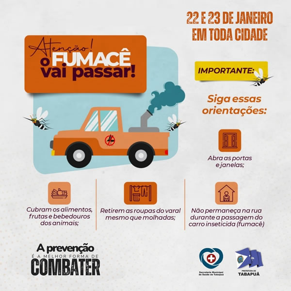 A Prefeitura Municipal, por meio da Secretaria de Saúde, informa que realizará a aplicação do fumacê contra o mosquito transmissor da dengue em toda a cidade, nesta quarta-feira e quinta-feira, 22 e 23 de janeiro.
