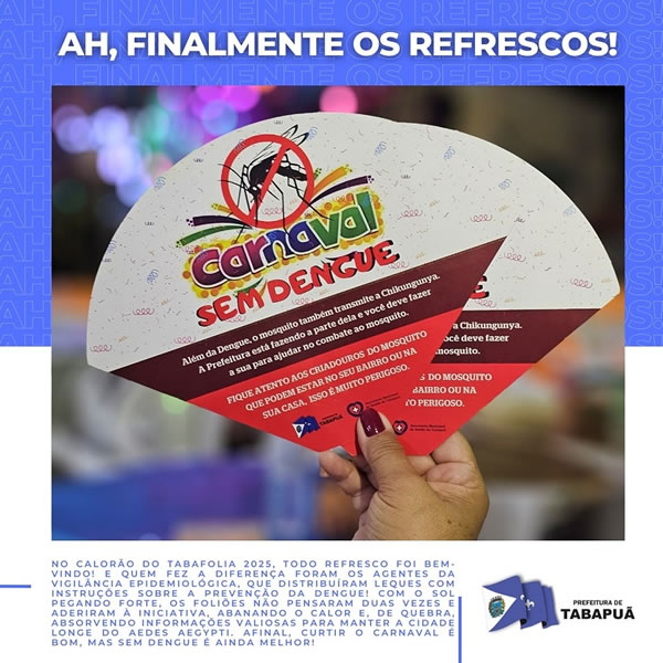 No calorão do TabaFolia 2025, todo refresco foi e é bem-vindo! E quem fez a diferença foram os agentes da Vigilância Epidemiológica, que distribuíram leques com instruções sobre a prevenção da dengue!