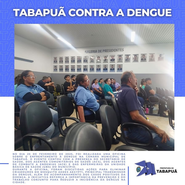 No dia 25 de fevereiro de 2025, foi realizada uma oficina sobre o enfrentamento à dengue na Câmara Municipal de Tabapuã. O evento contou com a presença do secretário de Saúde, dos agentes comunitários de saúde (ACS), dos agentes de combate a endemias (ACE) e das enfermeiras da Unidade Básica de Saúde (UBS) do município.
