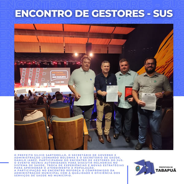 O prefeito de Tabapuã, Silvio Sartorello, acompanhado do secretário de Governo e Administração, Leonardo Bolonha, e do secretário de Saúde, Danilo Ianez, participou do Encontro de Gestores do SUS. O evento reuniu autoridades municipais e estaduais para debater melhorias no sistema público de saúde, promover a troca de experiências e traçar novas estratégias para aprimorar o atendimento à população.