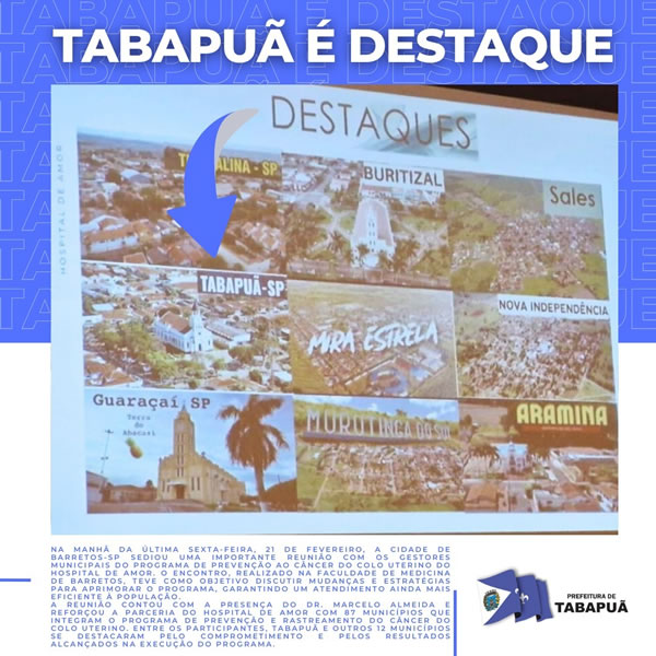 A reunião contou com a presença do Dr. Marcelo Almeida e reforçou a parceria do Hospital de Amor com 87 municípios que integram o programa de prevenção e rastreamento do câncer do colo uterino. Entre os participantes, Tabapuã e outros 12 municípios se destacaram pelo comprometimento e pelos resultados alcançados na execução do programa.