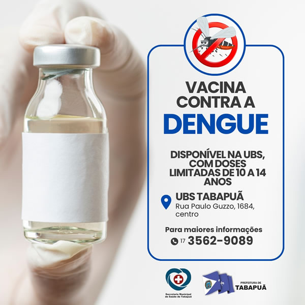 A Prefeitura de Tabapuã, por meio da Secretaria Municipal de Saúde, informa que a vacina contra a dengue está disponível na UBS Tabapuã para crianças e adolescentes de 10 a 14 anos.