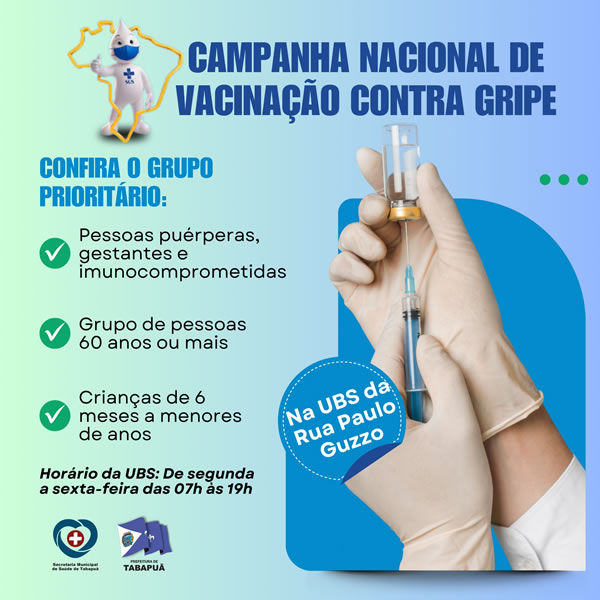 A Secretaria Municipal de Saúde comunica que vai começar a Campanha Nacional de Vacinação contra a Gripe e orienta quem faz parte do grupo prioritário a procurar a Unidade Básica de Saúde.