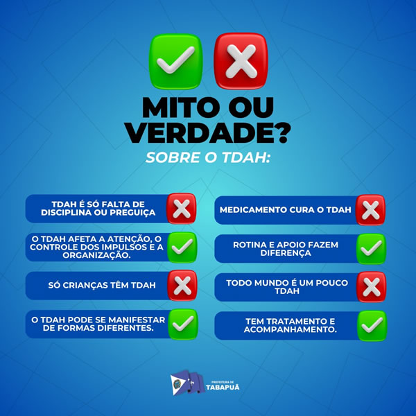 Até o dia 13 de julho, Dia Mundial de Conscientização sobre o TDAH, a Prefeitura de Tabapuã realiza uma campanha informativa, com conteúdos especiais para conscientizar e orientar a população sobre o tema. Acompanhe, compartilhe e ajude a levar essa mensagem mais longe.
