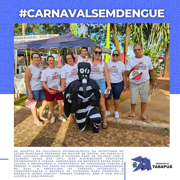 A ação faz parte da campanha #CarnavalSemDengue, na qual a Prefeitura de Tabapuã intensifica a conscientização e reforça os cuidados para combater o mosquito Aedes aegypti. Porque carnaval bom é com muita alegria e zero dengue!
