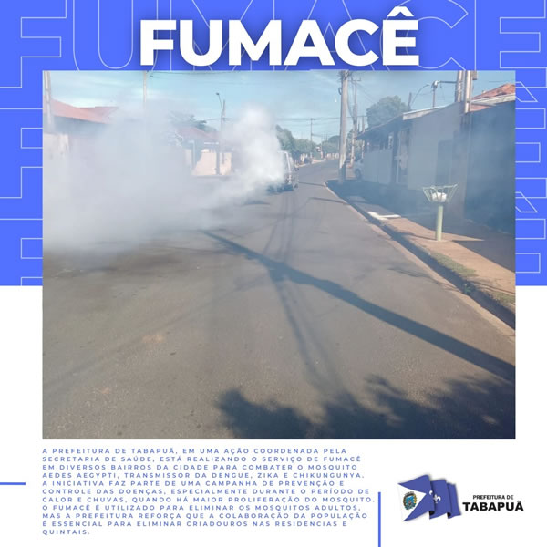 A Prefeitura de Tabapuã, em uma ação coordenada pela Secretaria de Saúde, está realizando o serviço de fumacê em diversos bairros da cidade para combater o mosquito Aedes aegypti, transmissor da dengue, zika e chikungunya.