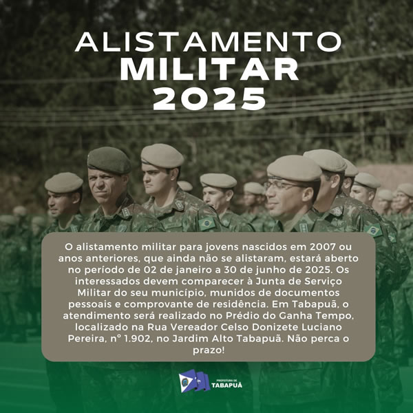 O alistamento militar para jovens nascidos em 2007 ou anos anteriores, que ainda não se alistaram, estará aberto no período de 02 de janeiro a 30 de junho de 2025.