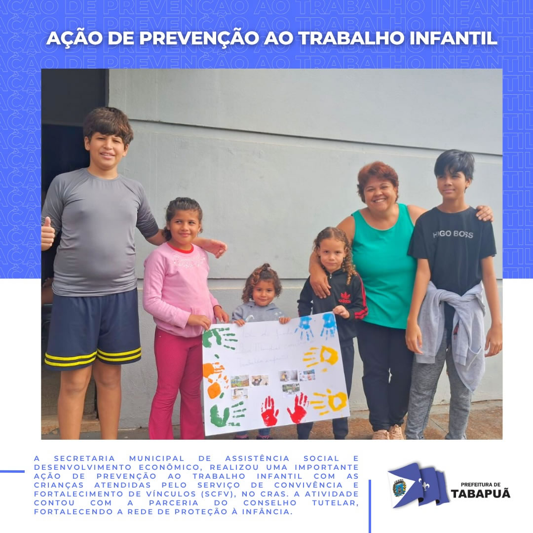 A Secretaria Municipal de Assistência Social e Desenvolvimento Econômico, realizou uma importante ação de prevenção ao trabalho infantil com as crianças atendidas pelo Serviço de Convivência e Fortalecimento de Vínculos (SCFV), no CRAS. A atividade contou com a parceria do Conselho Tutelar, fortalecendo a rede de proteção à infância.