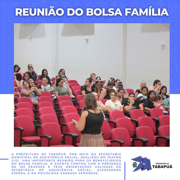 A Prefeitura de Tabapuã, por meio da Secretaria Municipal de Assistência Social, realizou no teatro Gigi uma importante reunião para os beneficiários do Bolsa Família. O evento contou com a presença de 153 pessoas e teve orientações valiosas da secretária de Assistência Social, Alessandra Simões, e da psicóloga Vanessa Veroneze.