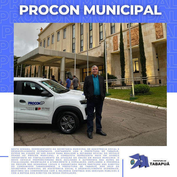 Nesta semana, representantes da Secretaria Municipal de Assistência Social e Desenvolvimento Econômico, juntamente com a Prefeitura de Tabapuã, esteve na cidade de São Paulo para realizar a retirada oficial do veículo doado ao PROCON Municipal. A conquista representa mais um avanço importante no fortalecimento da atuação do órgão em nosso município. O novo veículo proporcionará mais agilidade e autonomia nas ações de fiscalização, orientação e atendimento à população, ampliando a presença do PROCON nas demandas locais e garantindo maior proteção aos direitos do consumidor tabapuanense. A Prefeitura de Tabapuã, por meio da Secretaria Municipal de Assistência Social e Desenvolvimento Econômico, reafirma seu compromisso com a melhoria contínua dos serviços públicos e com a defesa dos direitos da nossa população.