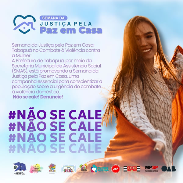 A Prefeitura de Tabapuã, por meio da Secretaria Municipal de Assistência Social (SMAS), promove a Semana da Justiça pela Paz em Casa: Tabapuã no Combate à Violência contra a Mulher. Essa iniciativa reforça a importância de enfrentar e combater a violência doméstica, além de incentivar a denúncia e garantir apoio às vítimas.