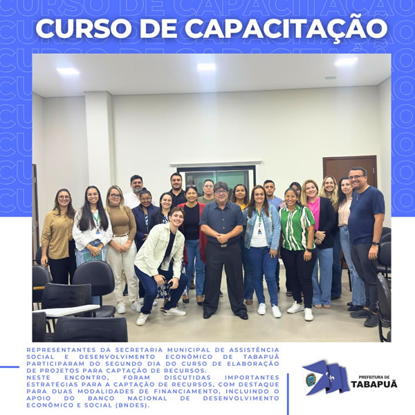 Representantes da Secretaria Municipal de Assistência Social e Desenvolvimento Econômico e da Secretaria Municipal de Saúde de Tabapuã participaram do segundo dia do curso de capacitação em Elaboração de Projetos para Captação de Recursos. Neste encontro, foram discutidas importantes estratégias para a captação de recursos, com destaque para duas modalidades de financiamento, incluindo o apoio do Banco Nacional de Desenvolvimento Econômico e Social (BNDES).