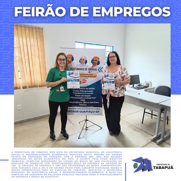 A Prefeitura de Tabapuã, por meio da Secretaria Municipal de Assistência Social e Desenvolvimento Econômico, realizou nesta semana um grande Feirão de Empregos em parceria com a empresa JBS, uma das maiores indústrias do setor alimentício do país.