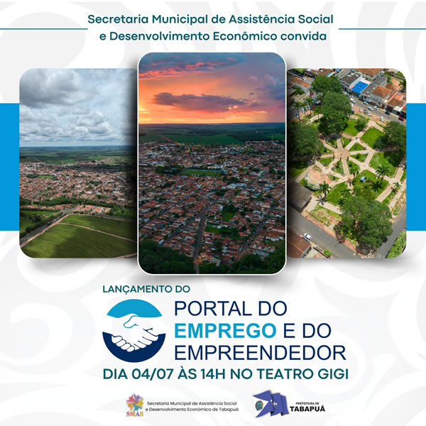 A Prefeitura de Tabapuã, por meio da Secretaria de Assistência Social e Desenvolvimento Econômico, convida você para o lançamento do Portal do Emprego e do Empreendedor!