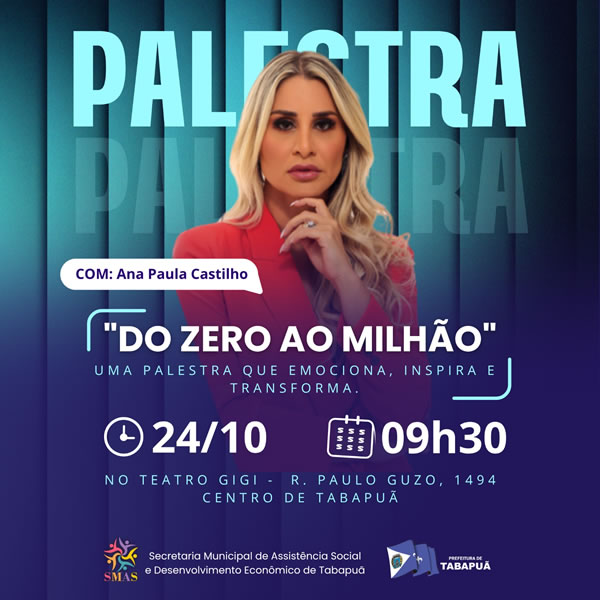 A Prefeitura de Tabapuã, por meio da Secretaria Municipal de Assistência Social e Desenvolvimento Econômico, convida toda a população para um encontro transformador com Ana Paula Castilho - empresária, palestrante internacional e fundadora da rede Conexão Delas, que impulsiona o empreendedorismo feminino em todo o Brasil.